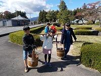 天秤棒と水桶で水運び体験をしました。開拓当時は毎日4kmの道を往復したそうです。体験では約100mを3人で交代しながら歩きましたが、それでも「肩がいたーーーい!」と悲鳴を上げていました。