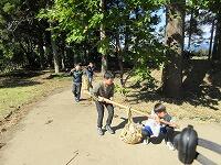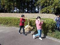 那須疎水の工事で使われた「もっこ」体験の様子です。こちらは2人で体験しました。実際の重さよりも軽い物を運びましたが、相当重かったようです。