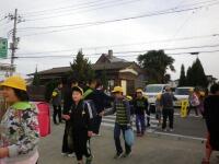 そして、『家庭科室から火災発生』の想定で、防災頭巾をかぶって校庭に避難しました。消火班の先生は、初期消火対応も行いました。