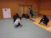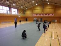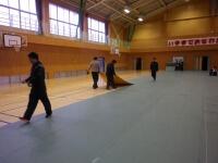 を行いました。パイプいすで体育館の床を傷めないように、ロールになっているシートを敷いて、ずれないようにとめていきます。専門職!?の小倉先生が、パイプいすを設置する位置のマーク