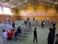 昨日の放課後、先生方でシートを敷いた体育館に、今日は集会タイムを活用して、5年生がいすを並べて会場設営