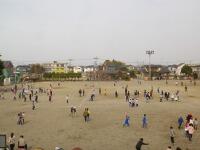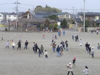 青い体育着姿は5年生。6の1は校庭の中央部で、パワフルドッジボール!他にも、ケイドロ、おにごっこなど、児童340人