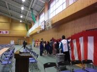 を行いました。パイプいすで体育館の床を傷めないように、ロールになっているシートを敷いて、ずれないようにとめていきます。専門職!?の小倉先生が、パイプいすを設置する位置のマーク