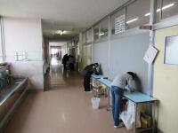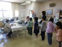 検診。保健室前の廊下では、3年生が静かに並んで待っていました。一人ずつ学校医の井本先生に見ていただきます。
