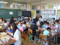 給食の時間には、1~6年生の各教室で、児童と共に給食会食