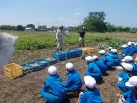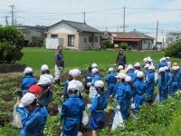 に恵まれて、2年生はじゃがいもの収穫体験に出かけました。農家の方にごあいさつして、じゃがいもの堀り方について説明を聞いたら、さっそく掘ってみましょう。