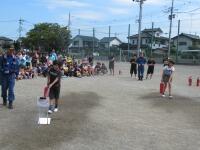 消火体験では、高学年代表児童と先生の代表が、消火器を使って火を消す模擬体験をしました。