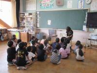 4年生 2組は小倉先生が、絵本の画像を大きく写して読み聞かせ。