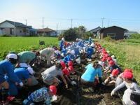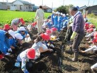 1年生も畑にやってきました。マルチをはがしたところから、一生懸命に掘っていきます。川上さんもスコップで、掘るお手伝いをしてくださいました。「掘れました~