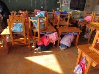 緊急放送が流れると、校庭で遊んでいた児童は遊具から離れてその場にしゃがみ、教室で残っていた児童は、これまでの避難訓練を生かして机の下にもぐっていました。先生がいなくても、放送の指示で素早く校庭に避難することができました。