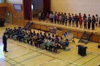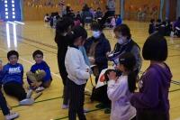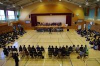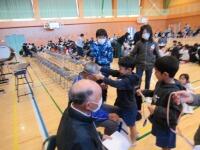 をしました。仲良し班ごとに輪を作り、ボランティアの方々をお迎えしたら、1・2年生がメダル