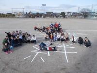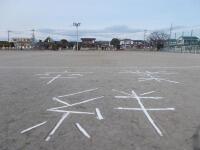 児童の帰った後の校庭には、「卒業」「絆」の文字が、、、6年生児童が自分たちで、自発的に書いた文字です。感動!