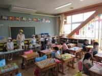して、持ってきているハンカチとティッシュ先生に見せていました。これまでの分散登校では、どのクラスも半分ほどの出席でしたが、今日はどの教室もみんな