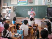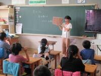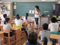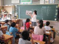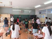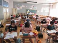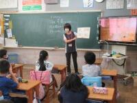 これまでは、机を教室の後ろに寄せてボランティアさんのまわりに集まってお話を聴いていましたが、再開にあたって「密」をさけるため児童は自分の席