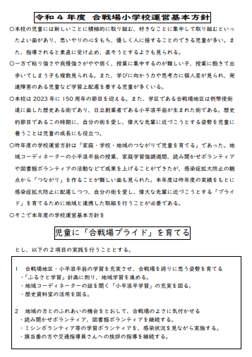 〇合戦場は、長い歴史のある地区であり、日立創業者小平浪平翁が生まれ学んだ地区です。そのようなふるさとにプライドをもち、また、浪平翁の学んだ合戦場小で学べることのプライドを子どもたちにもってもらいたいという願いで、本年度の学校運営基本方針を決めました。