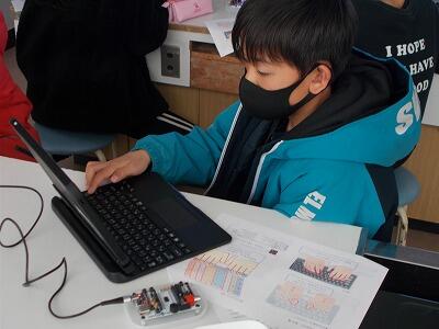 〇2月14日(火)、5年生が栃木工業高校生にプログラミングを教えていただきました。スカイベリージャムコンピュータにプログラムを入れ、コンピュータを操作しました。