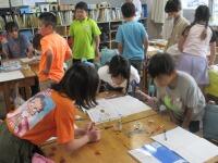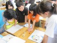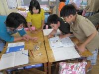 その後、「あたたかい-冷たい星」の比較実験をした班と、「空気あり-なし星」の比較実験をした班で、互いに交流グループし、結果を確認し合いました虫眼鏡