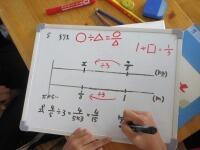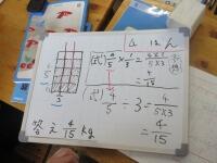 続いて各班からの発表お知らせです。それぞれ、図や数直線星を用いて、自分たちの言葉お知らせで説明することができました花丸。結論として、4/5の分母に3をかけることで、答えが出せる!というまとめになりました花丸