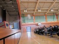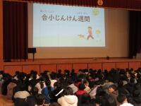 6年生代表児童にっこりの司会お知らせのもと、まず担当の先生笑うから、人権についてのお話がお知らせありました。合わせて、人権週間での取組イベントについても、説明お知らせがありましたキラキラ