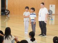 始めに4年生代表の児童2名が、2学期に頑張りたいことを話しました。「明るい声であいさつすること、お手本となる行動をすることを頑張っていきたい。」「算数の勉強、それから、自分進んであいさつをすることを頑張っていきたい。」とそれぞれの目標を発表しました。堂々としたすばらしい発表でした。