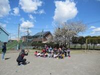 校庭に出てきた子どもたち、ピンク桜の前では3年生が、白桜の前では2年生が学級の写真を撮影中。