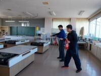 「火災発生・避難開始」の指示で、素早く校庭に避難しました。そのころ消火班の先生方は、家庭科室の消火対応も行いました。