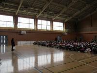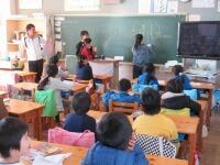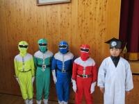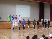 集会の後は、給食博士と給食レンジャーのみなさんが児童をお見送り