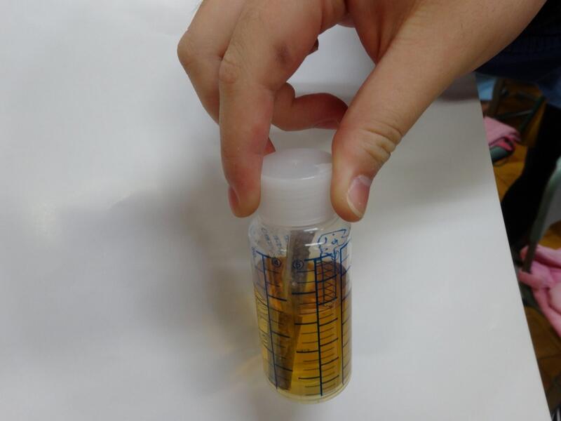 お湯に数分浸した「たばこ1本に含まれる薬物の量」を目で見たり、全員がアルコールパッチテストの体験をするなど、実験を交えながら、たばこ・酒の害について学習しました。