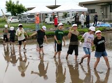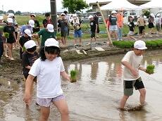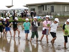 田んぼに入る子供たちは、最初は慣れない足取りで不安そうでしたが