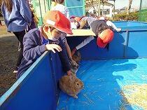 犬、ウサギ、モルモット、ミニブタ、ヤギ、ヒツジがゲージに入っている様子を見るだけでも癒されますが、犬やウサギ、モルモットは実際にふれることができたので、1,2年生は大喜びでした。