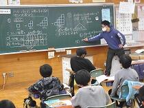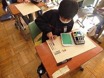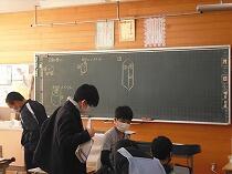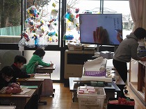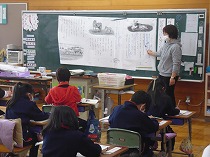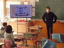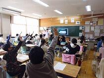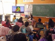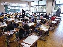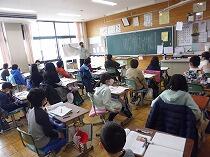 1年生は、黒板の大きな資料や担任が示す大型テレビからの情報を使って、一生懸命課題を解いていました。