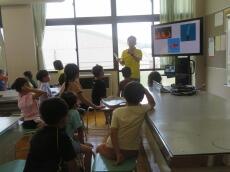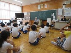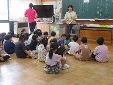 初日は、2年生がちょうど校外学習に出かけていたので1,3,4年生の教室でやってもらいました。子供たちは、本をのぞき込みながら真剣に聞いていました。