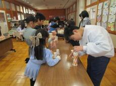 1年生は、図工で作った作品で楽しそうに友達とお話していました。