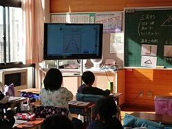 直角三角形や二等辺三角形、正三角形などについて、それぞれどんな特徴をもっているのか、テレビ画面をとおしての先生の助言を聞いたり、教科書の図を見たり、実際に辺の長さを測ったりしながら調べていきました。