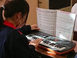 音楽室にあるピアノや電子キーボード、鉄琴、木琴などの学期を一人一人がパートに別れて練習しています。