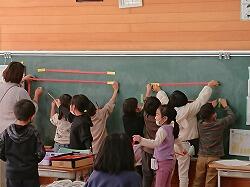 調べたテープをみんなで黒板に貼ることで、いろいろな物の長さを比べることができました。