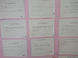 これは、秋に行った班でゲームをしていく「国府北秋まつり」の際に、自分の班のよいところを見つけたらカードに書くという活動を取り入れた時のものです。
