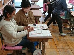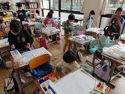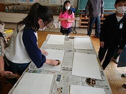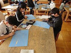 手が痛くなったと言いながらも彫刻刀で一生懸命掘り進めていたり、すでに、刷る段階に入っている児童もいたりしました。