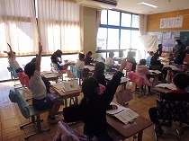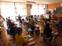 呼び掛けるように話をすると「はい」と返事をする児童がたくさんいて、これまでのご家庭や幼稚園、保育園等での学びが身に付いていることが伝わってきました。