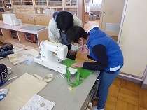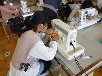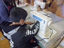 5年生は、糸の出し方やミシンの操作について集中して映像を見て学び、その後実際に縫いました。