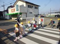 学校の校門前の横断歩道では、班長さんが班員を気遣いながら一列でしっかり歩いたり横断したりしていました。