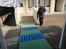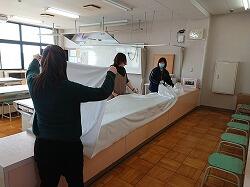 先生方で式場のテーブルに使う白いカバーにアイロンをかけたり、業務員さんが体育館に行く渡り廊下にピッタリ合う渡り板を作ってくれたりしました。