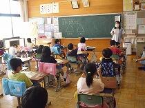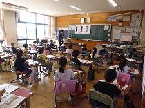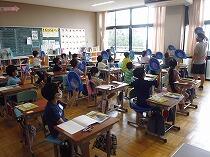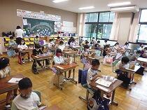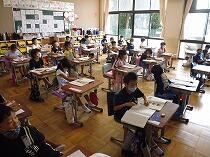 1年生の教室でも朝からしっかり席に着いて先生の話を聞いており、児童の頑張る様子が見られました。
