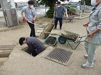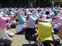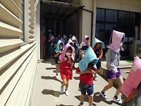 避難する際は、上履きのまま避難するため、避難後は環境委員会の児童が、上履きを拭くための雑巾を準備したり片づけたりしてくれました。