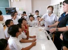 4年生の理科の授業は、空気や水の性質の実験でした。水の入ったフラスコを温めたり、冷やしたりすると、フラスコにつないだガラス棒の中のゼリーや水が上ったり下ったり!不思議ですね。「なぜだろう?」子供たちは、興味津々。とても素敵な場面でした。