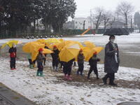 1年生は、外に出て雪が降って校庭や校舎にどんな変化があるのか探検に行きました。