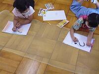でこぼこの模様を画用紙に出すためにオープンルームでわざとでこぼこした素材の上で描いている子もいます。