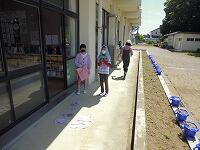 避難する際は、上履きのまま避難するため、避難後は環境委員会の児童が、上履きを拭くための雑巾を準備したり片づけたりしてくれました。