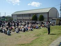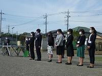卒業生も登校し、全児童が校庭で離任式に参加しました。
