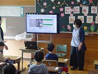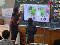 教室で大型テレビを使って、話を聞いた後、実際にトイレに行って、スリッパの並べ方や学校のトイレについて学びました。